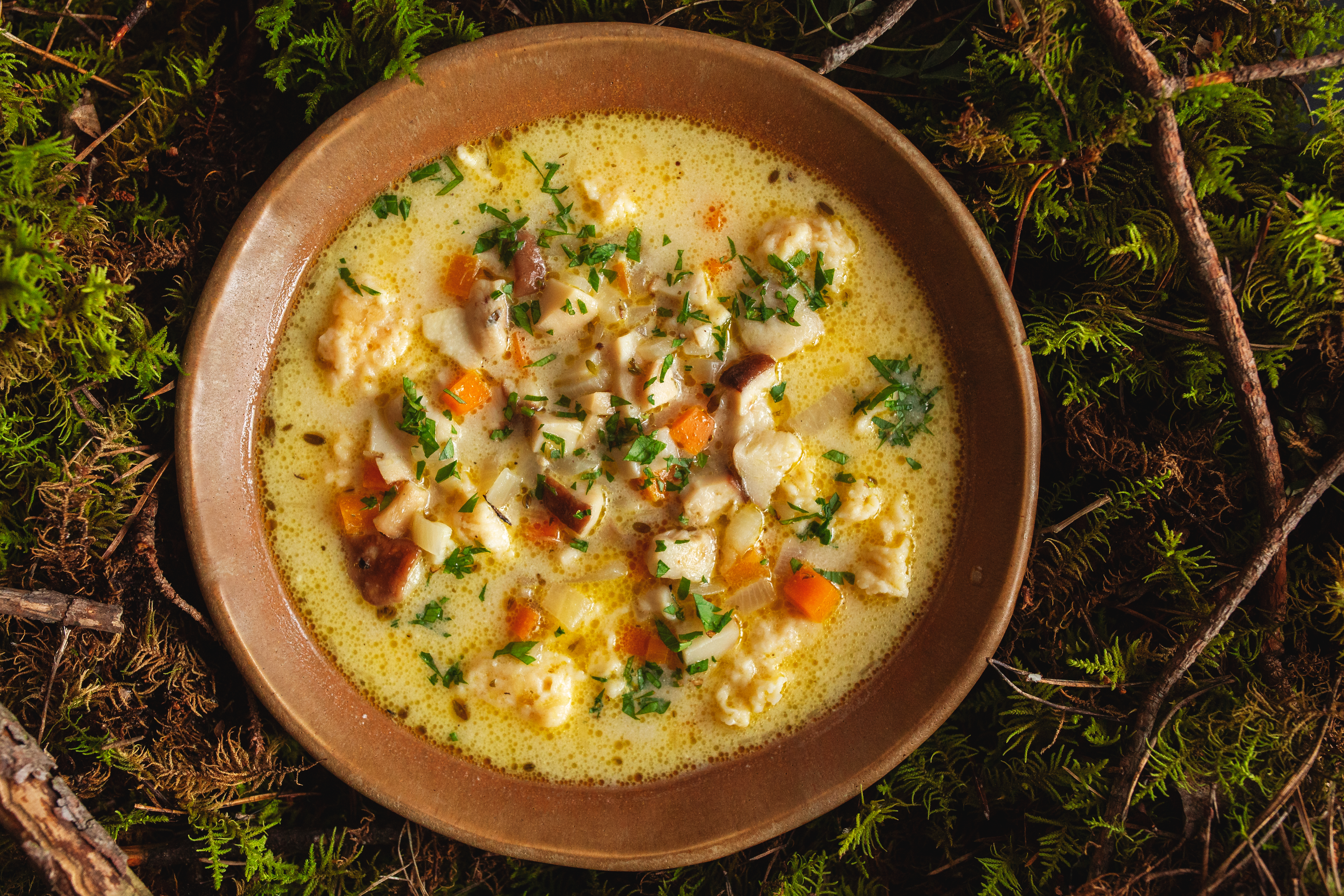 Zupa borowikowa z kluseczkami serowymi i macierzanką
