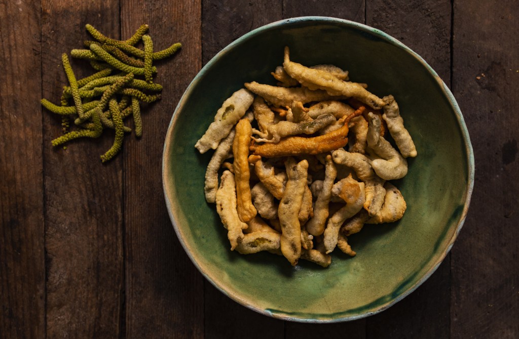 Rozgrzewamy tłuszcz w małym garnku do ok 170 stopni C. Zanurzamy kwiatostany (pojedynczo) i smażymy na złoty kolor, wyławiamy i odsączamy na papierze z tłuszczu