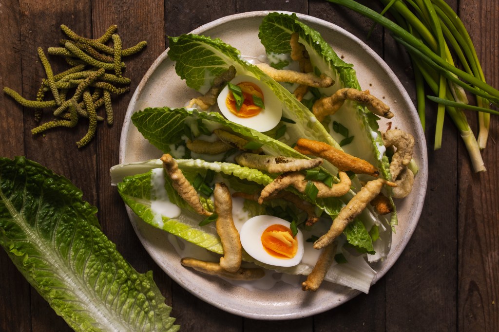 Sałatka na bazie sałaty rzymskiej z sosem majonezowo-jogurtowym, jajkiem, szczypiorem i smażonymi kwiatami leszczyny 😉
