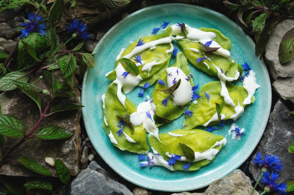 Postanowiłem tym razem mięte tą połączyć z serem w pierogach;) Aby Pierogi te jednoznacznie sie kojarzyły zabarwiłem je świeżym szpinakiem. Oczywiście nie odmówiłem sobie dekoracji w postaci płatków przepięknych bławatków;) Zapraszam po przepis
