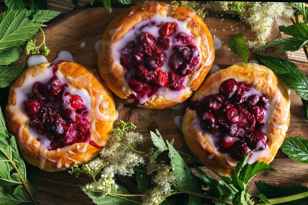 Postanowiłem użyć kwiatów wiązówki wraz z wiśniami w bułkach drożdżowych. drożdżówki z wiśniami i lukrem to grzech, ale jakże wspaniały grzech 😉
