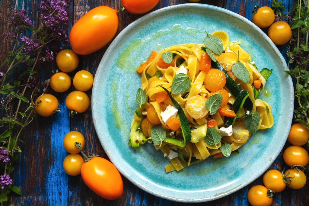 Makaron z cukinią, żółtymi pomidorami i lebiodką pospolitą