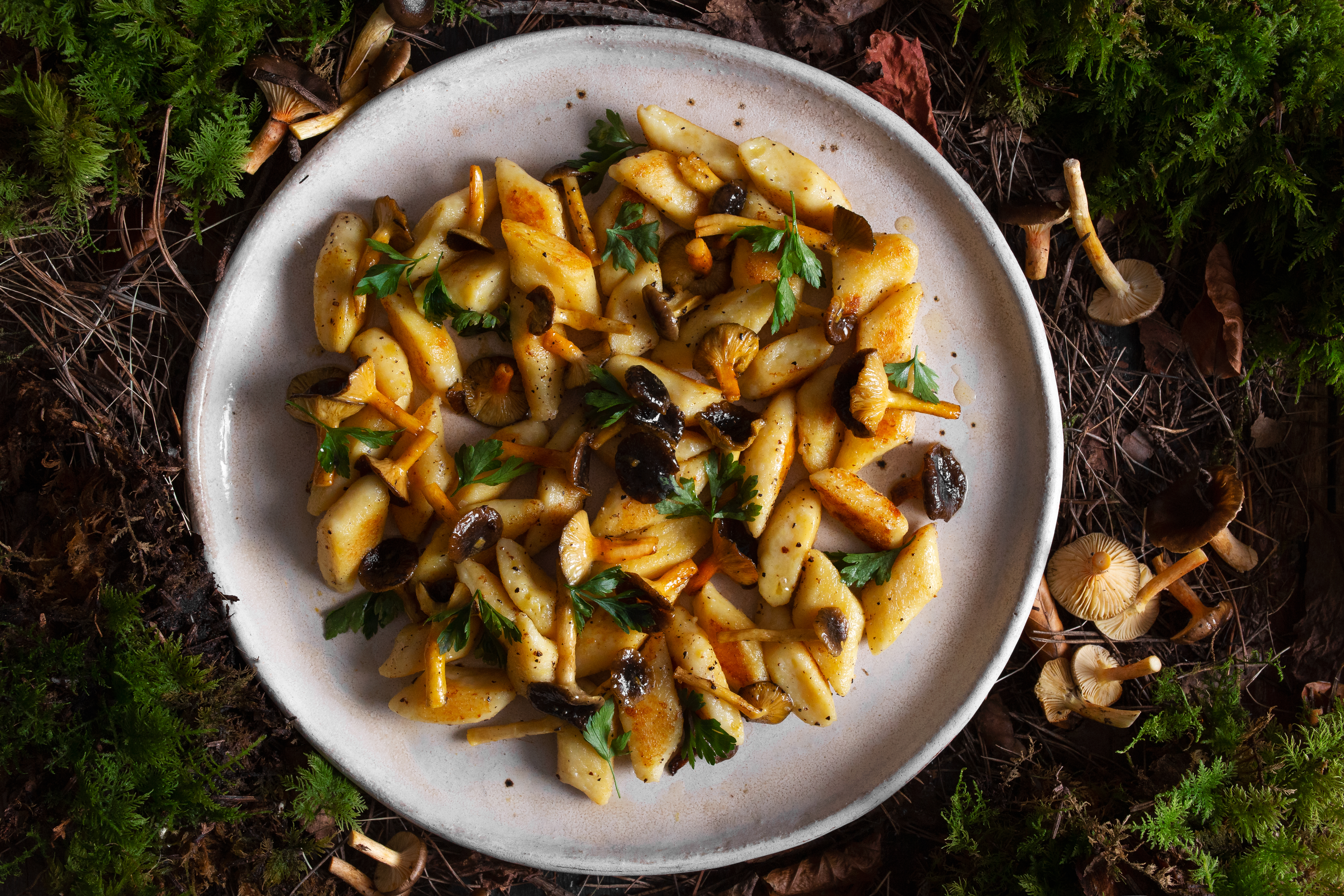 Na patelni rozgrzewamy masło i wrzucamy nasze kluseczki, kiedy się zrumienią dodajemy oczyszczone wodnichy. Smażymy wszystko razem a na koniec dodajemy sól i świeżo stary pieprz któremu pozwalamy odrobinkę się podsmażyć i oblepić kopytka.