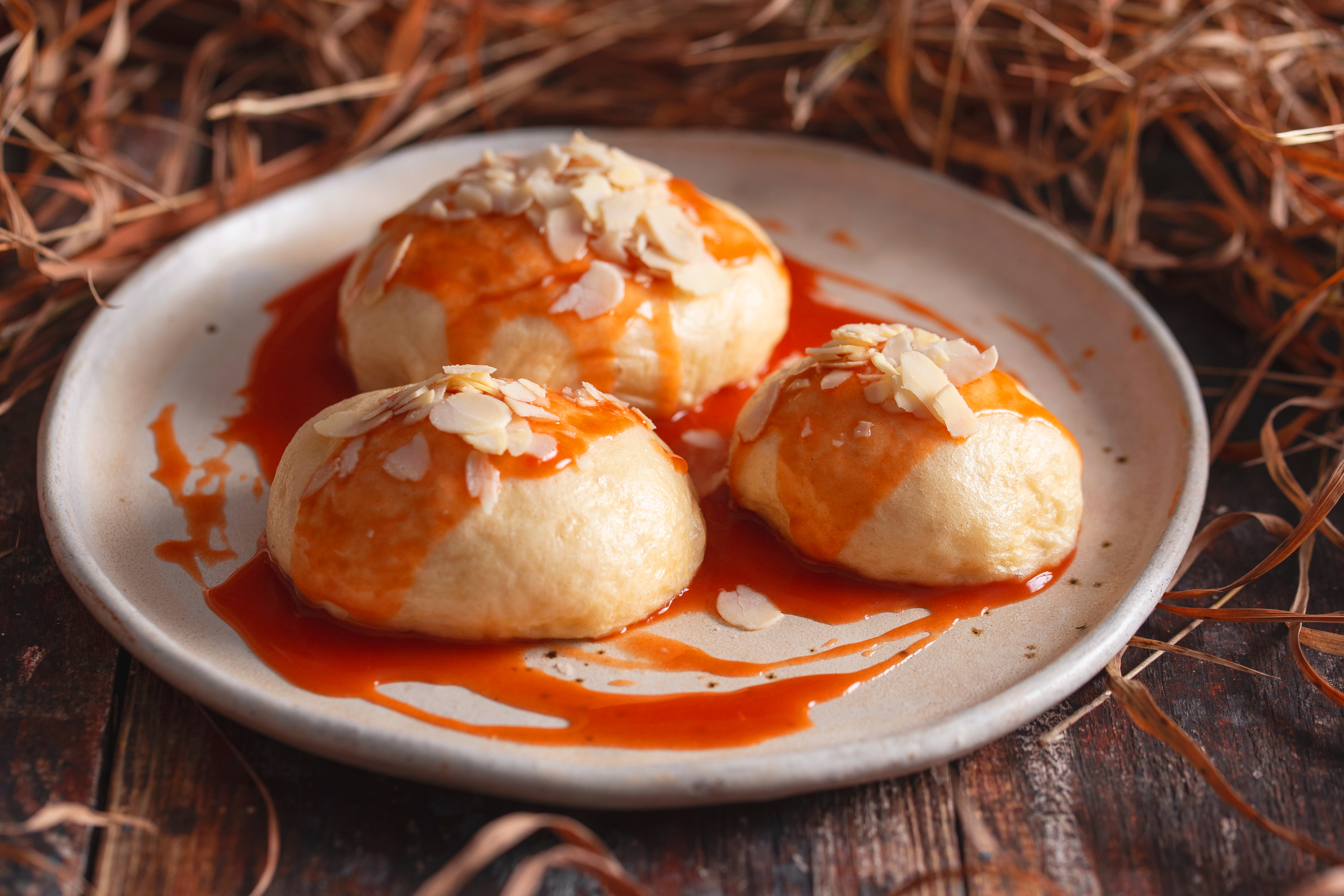 Zdejmujemy i polewamy je sosem z dzikiej róży, całość kończymy płatkami migdałów – gotowe;)