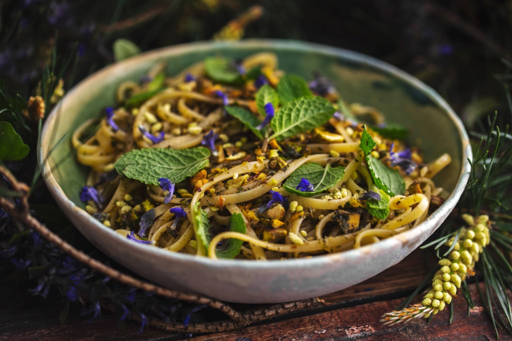 Kiedy makaron jest ugotowany przerzucamy go na patelnie z oliwą, miętą i pistacjami.