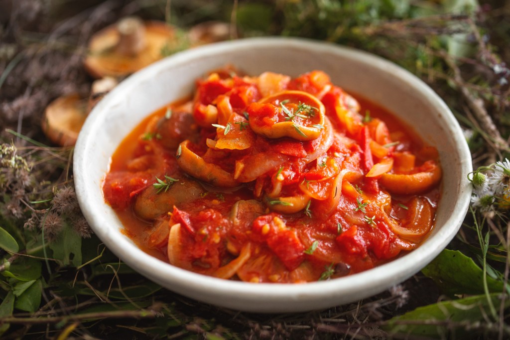 Rydze kroimy w paski, małe grzybki zostawiamy w całości. Wrzucamy je do cebuli i dusimy razem kilka minut. Pomidory kroimy w kostkę.