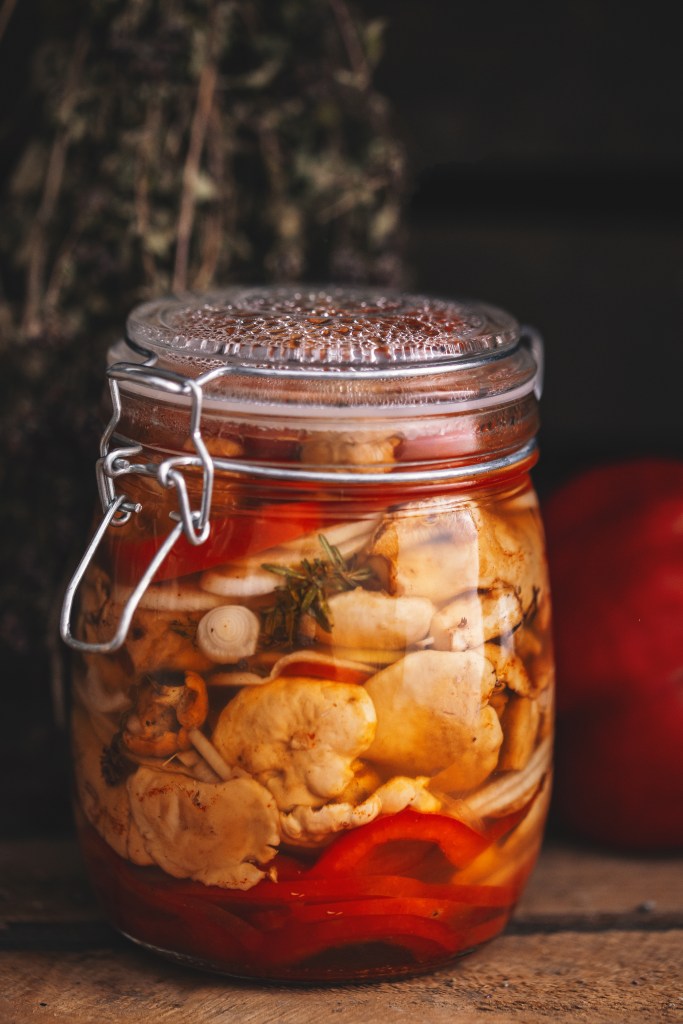 W słoiku ciasno upychamy grzyby na przemian z papryką i cebulą.