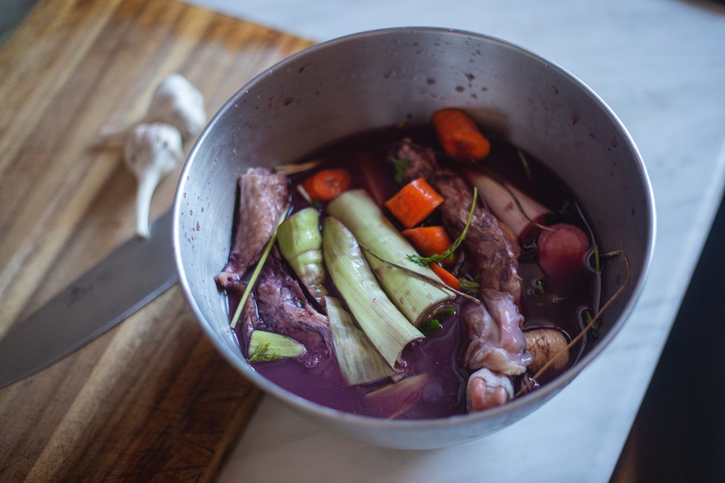 Układamy koguta w naczyniu, wsypujemy włoszczyznę i zalewamy go winem, całą butelką, tak aby był przykryty płynem. Wstawiamy do lodówki na 24h.