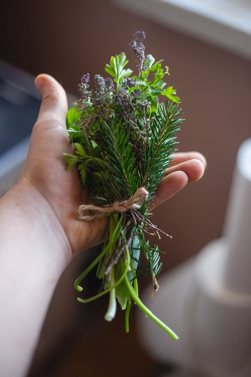 Z zielonych ziół tworzymy mały bukiecik i związujemy go sznurkiem, również ląduje on w garnku.