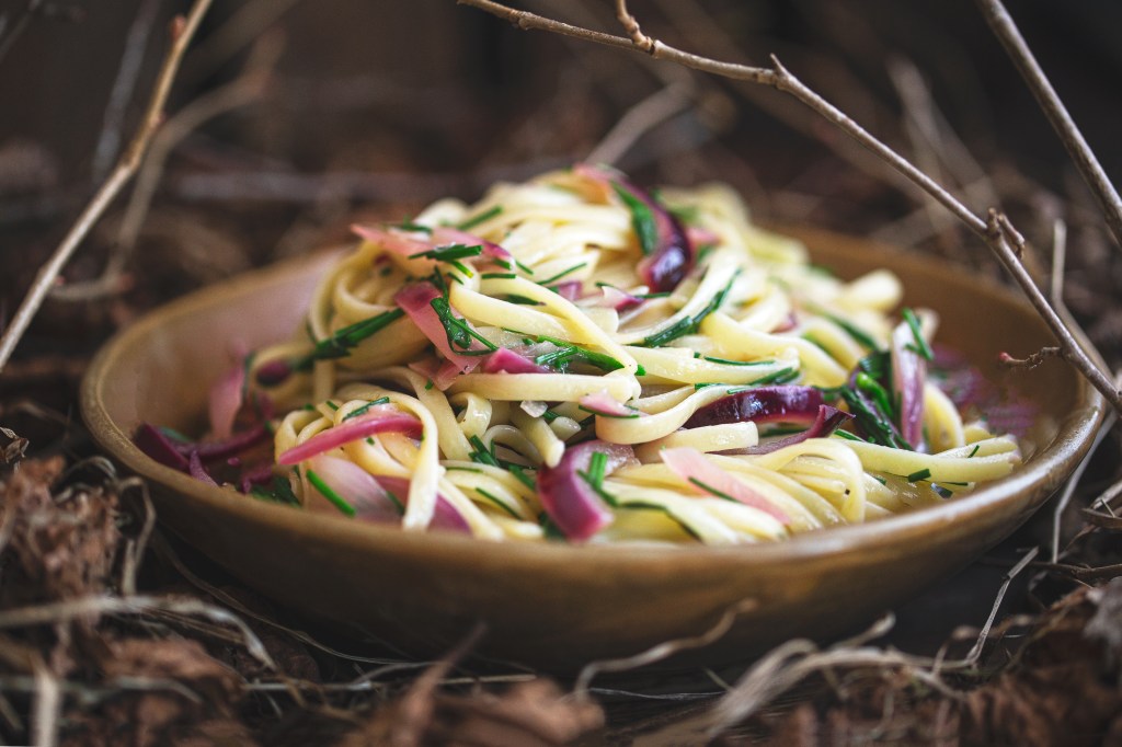 Przenieśmy się z azjatyckich noodle na włoską ziemię. Jest pewien przepis klasyczny dla Włoch ale mam wrażenie, że u Nas jest on nieznany a mianowicie makaron z czerwoną cebulką i białym winem. W oryginale daje się tam zieloną pietruszkę a ja postanowiłem zamiast niej użyć zebranego na spacerze szczypioru którego cebulowy, świeży smak pięknie podbija to danie.