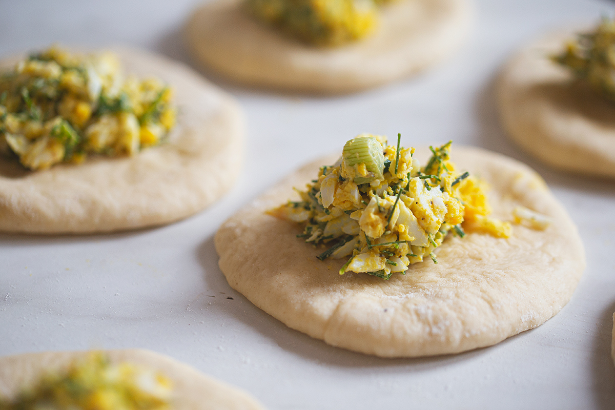 Na każdy placuszek nakładamy farsz i zlepiamy go trochę jak pieroga albo jagodziankę, przekładamy na blachę do pieczenia z papierem łączeniem do dołu.