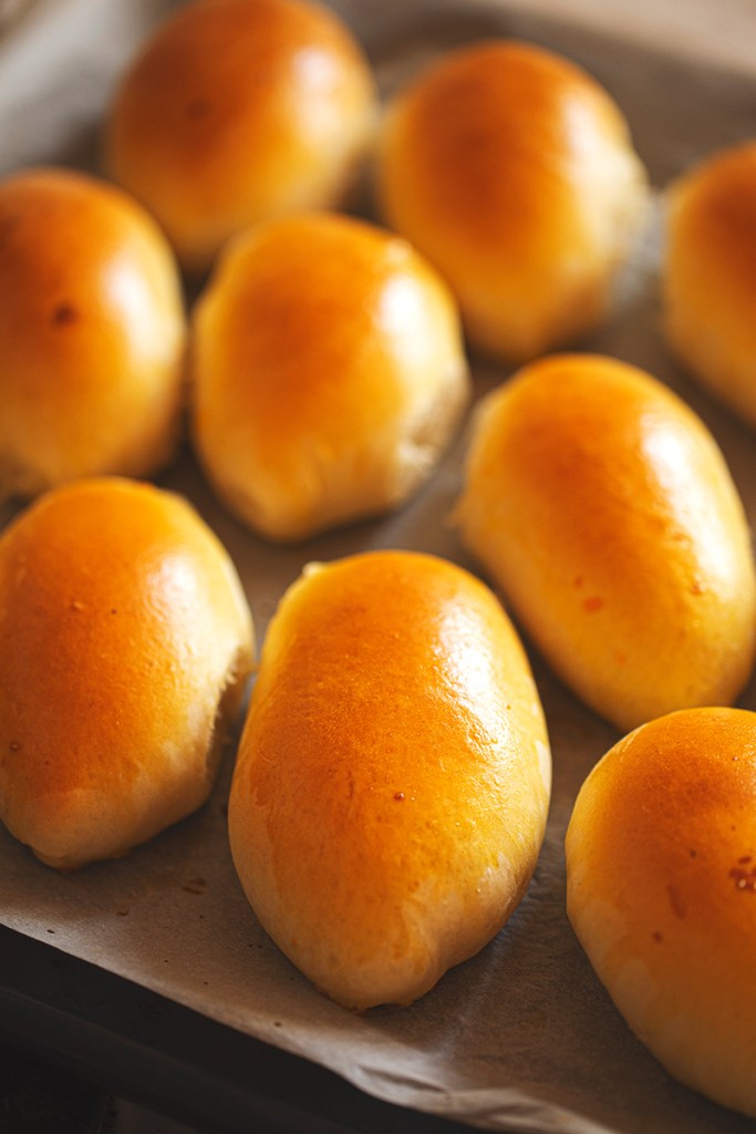 Wyrośnięte bułki smarujemy żółtkiem z mlekiem i pieczemy do zrumienienia.