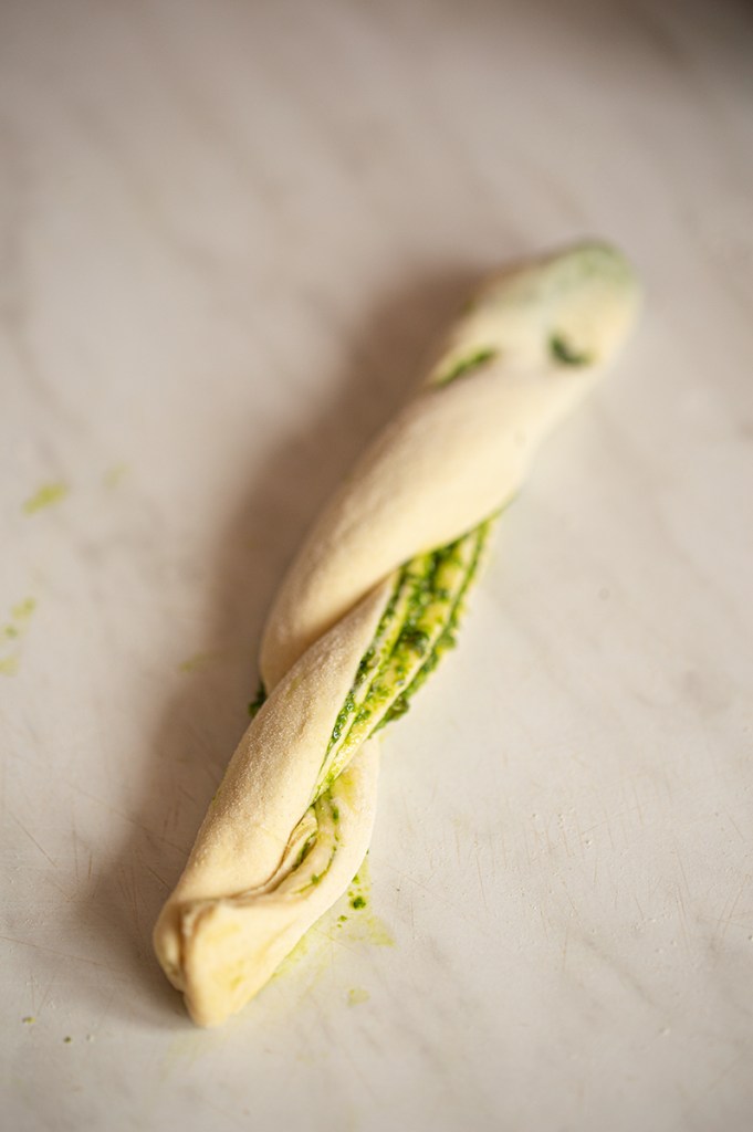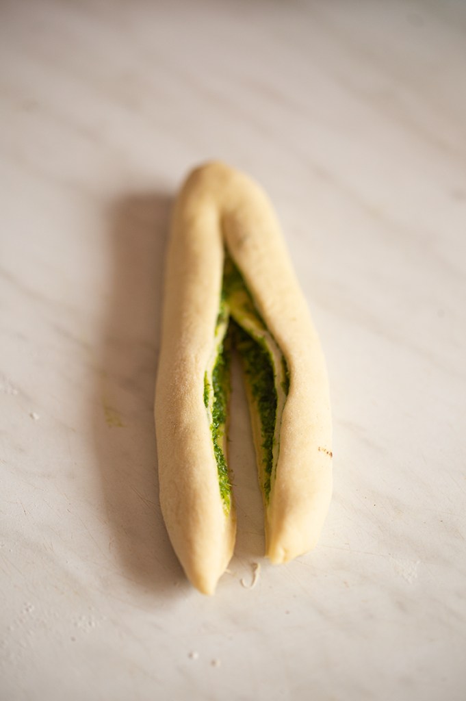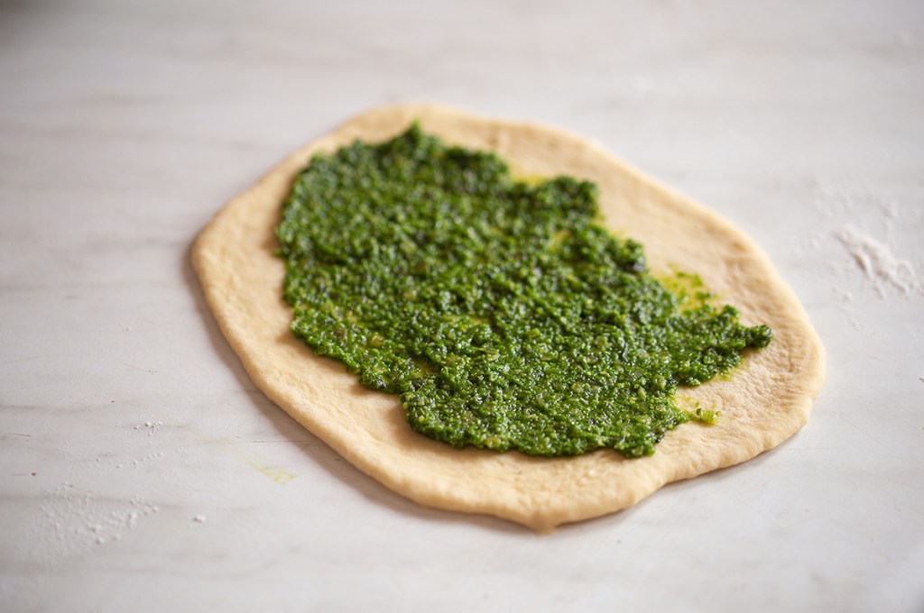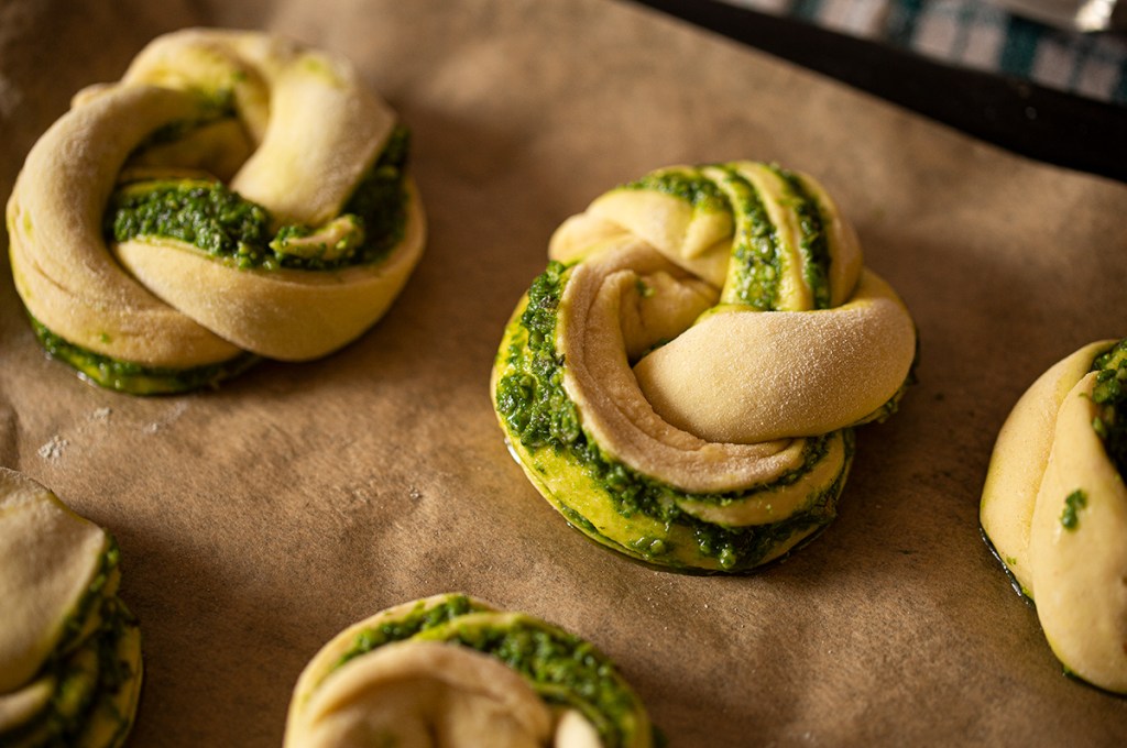 Kiedy bułeczki urosną żółtko mieszamy z odrobiną mleka i smarujemy je tam gdzie nie ma pesto.