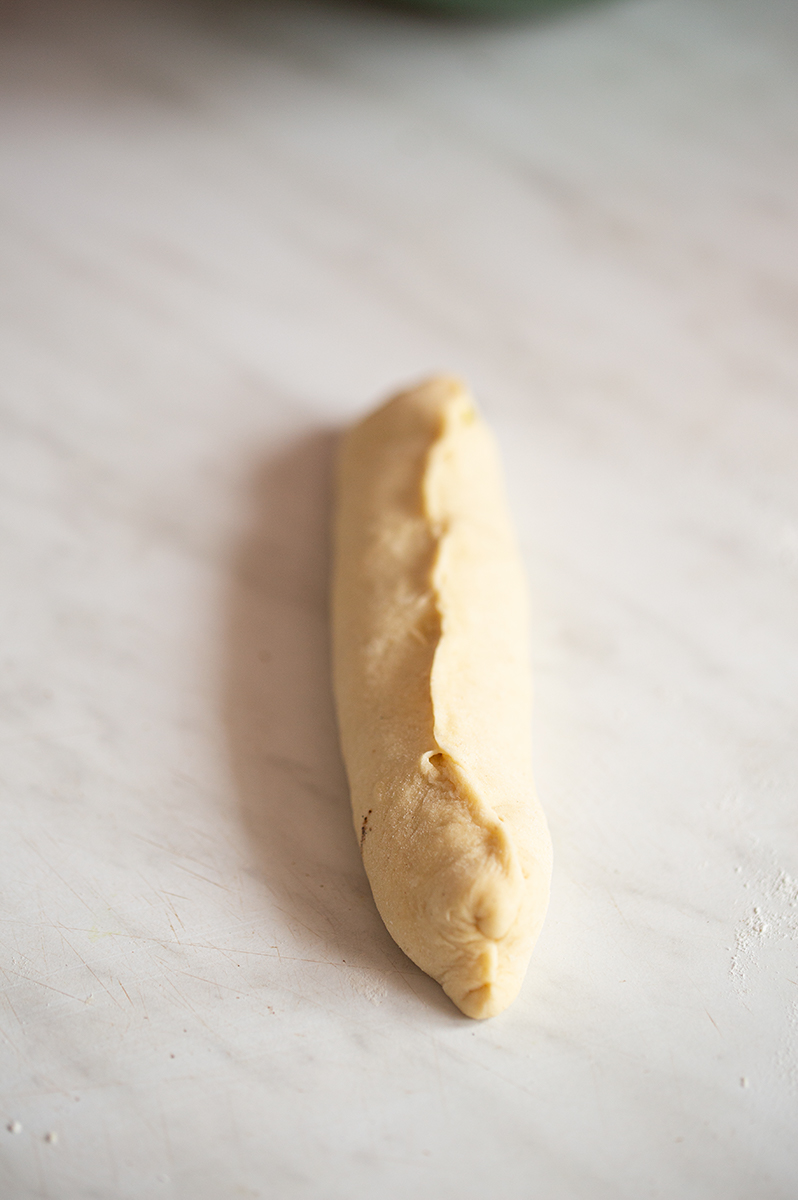 Rozcinamy wałeczek wzdłuż prawie do końca. Zawijamy powstałe kawałki w warkoczyk, naciągamy i składamy w okrąg.