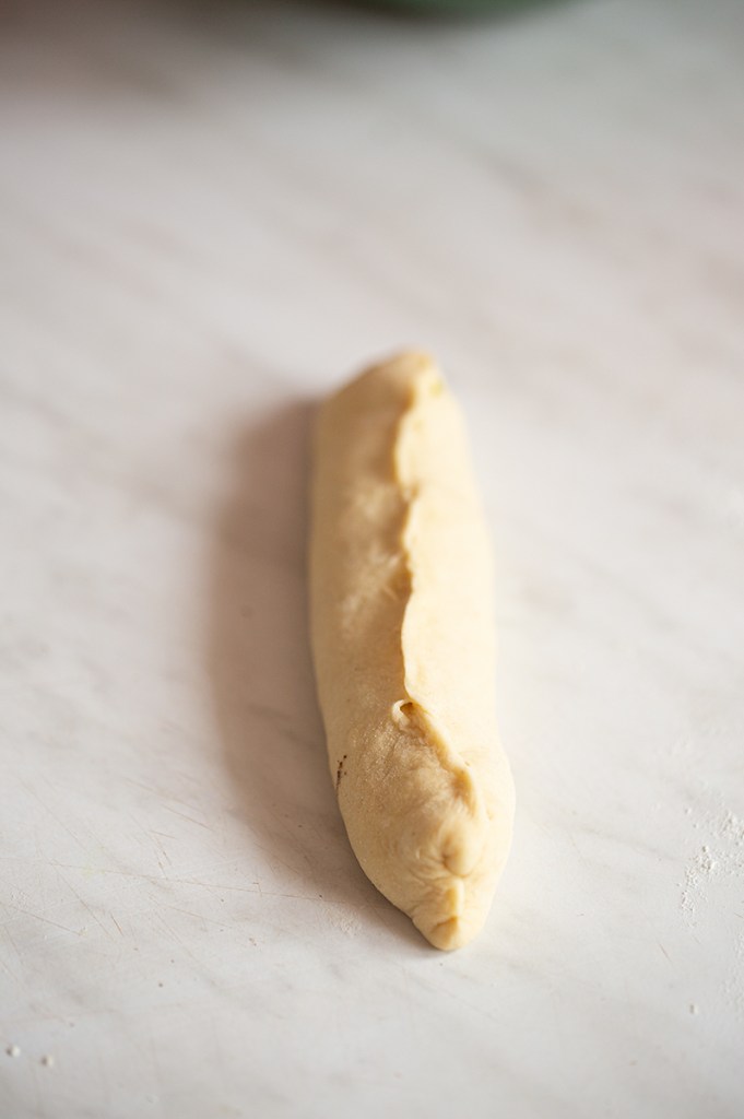 Kiedy ciasto wyrosło ugniatamy je aby pozbyć się powietrza i dzielimy na kawałki po 70 g.