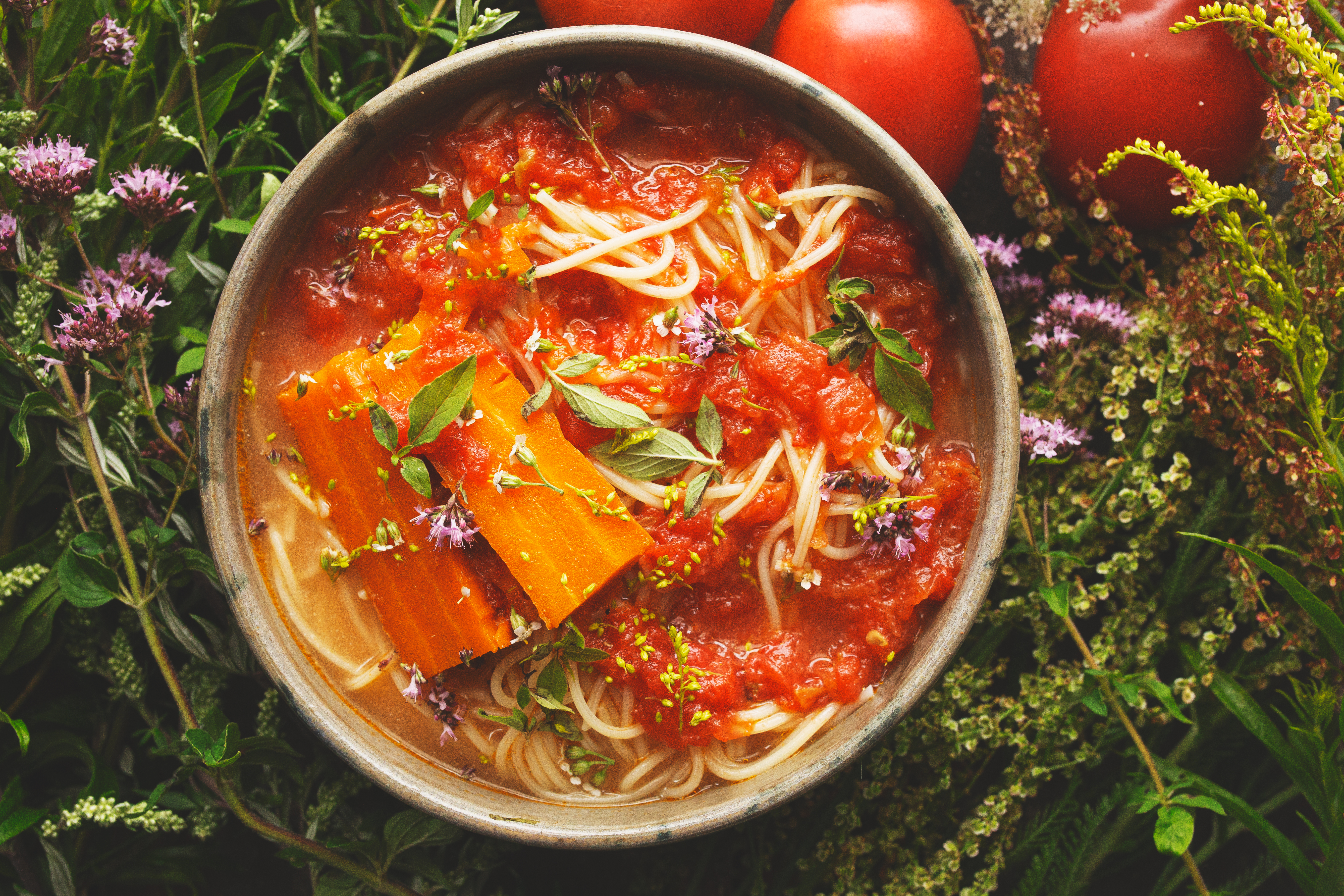 Mam swoje cudowne pomidory i oczywiście ciągle coś z nich pichcę, ale jednak nie dodałabym dzikich ziół. Rodzina uważa, że z pomidorowa nie można eksperymentować :-DD