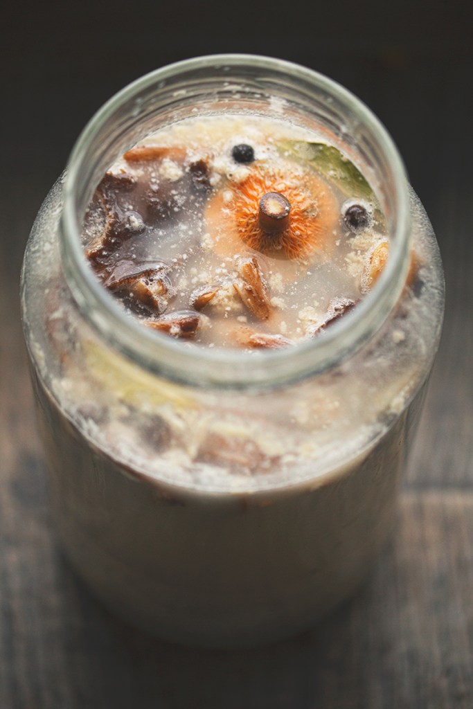 W czystym naczyniu (słój/glinianka) na dno wsypujemy mąkę, ok 1/3 objętości naczynia. Wrzucamy obrane ząbki czosnku, listki laurowe i ziele oraz obgotowane grzybki. Zalewamy wszystko wodą z solą kiedy ona przestygnie. Zostawiamy w cieple na 4-6 dni, dobrym wskaźnikiem jest to, że w gotowym zakwasie grzybki opadają na dno;)