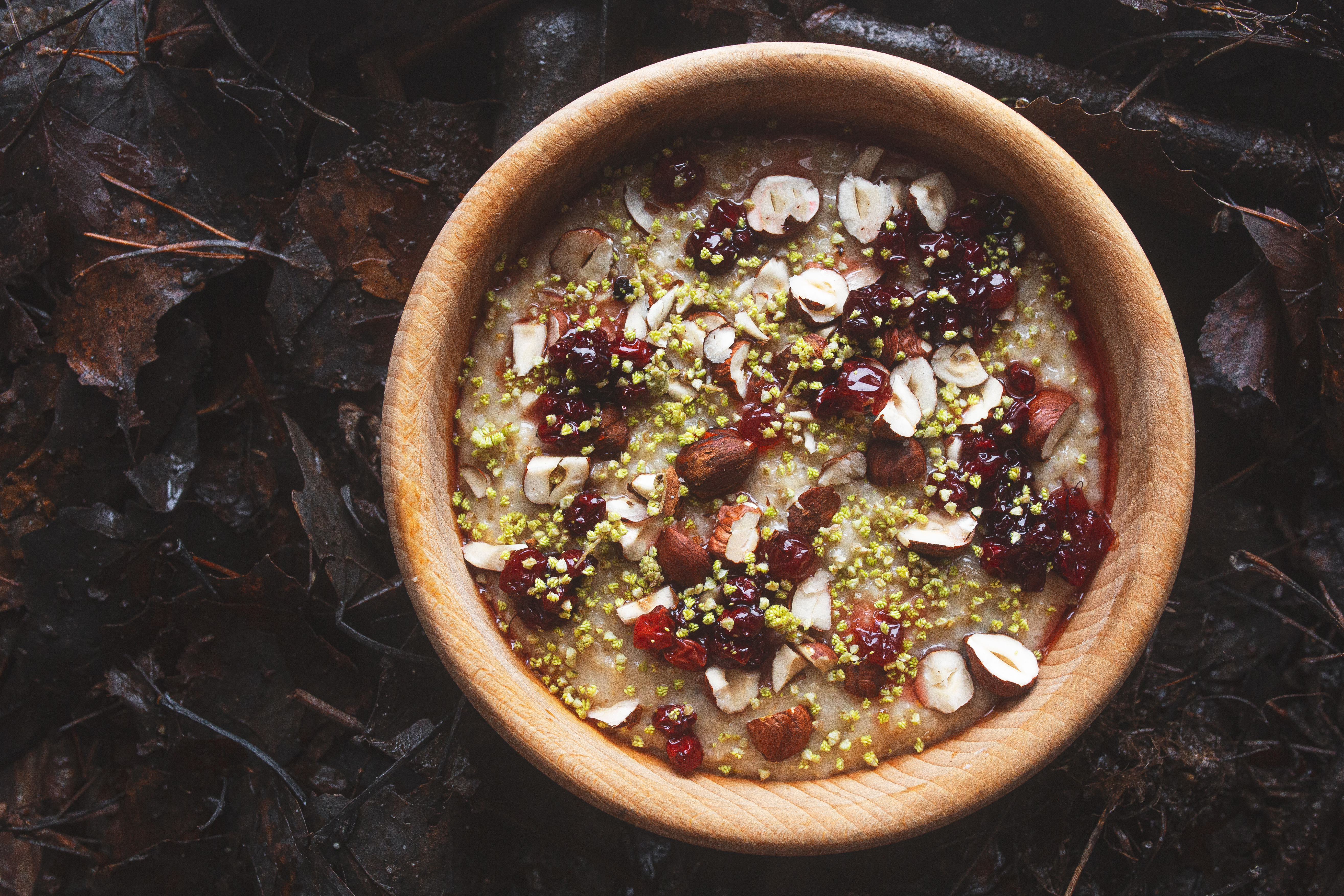 Podajemy posypaną ulubionymi orzechami/pestkami wraz z kwaśnymi owocami.