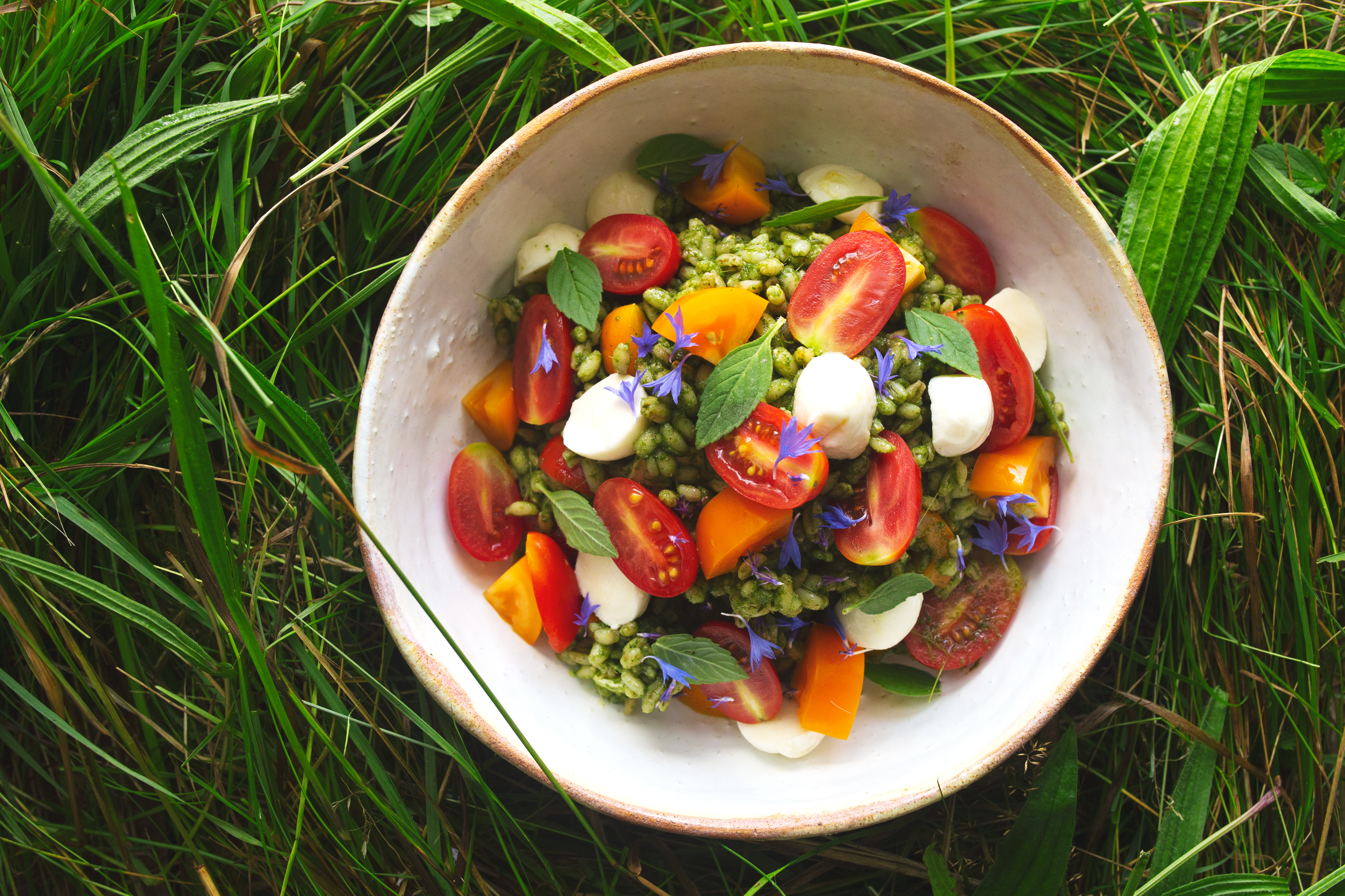 Taką kaszę wymieszać możemy ze swoimi ulubionymi pomidorami, ważne aby były słodkie i było ich sporo, ja dodatkowo dodałem mozzarelle i listki mięty polnej – sałatka wyszła super.