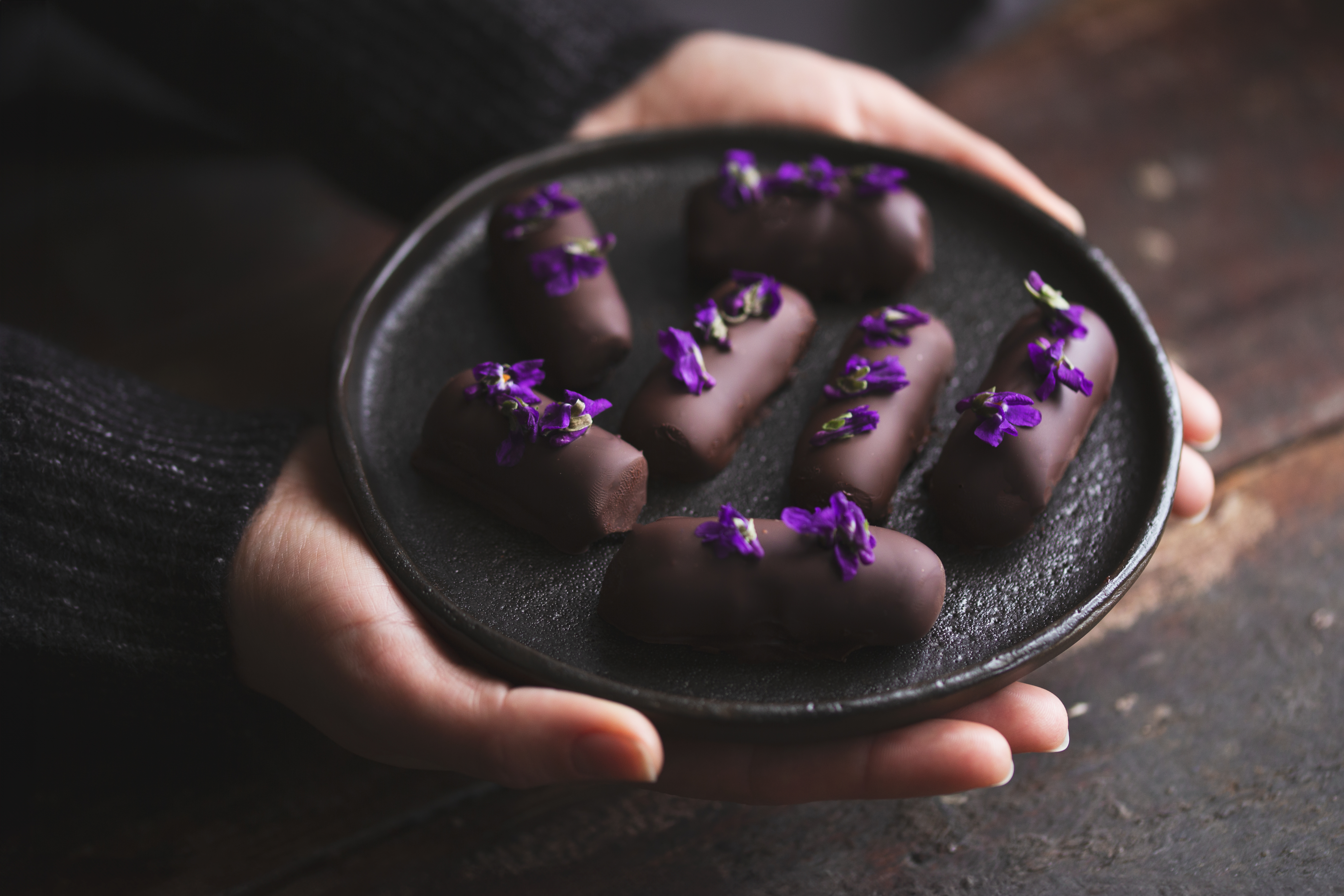 Kiedy jest lekko ciepła, mocno zmrożone batoniki twarogowe oblewamy dokładnie czekoladą, można opcjonalnie udekorować je fiołkami. Zostawiamy aby masa w środku się rozpuściła, podajemy schłodzone.
