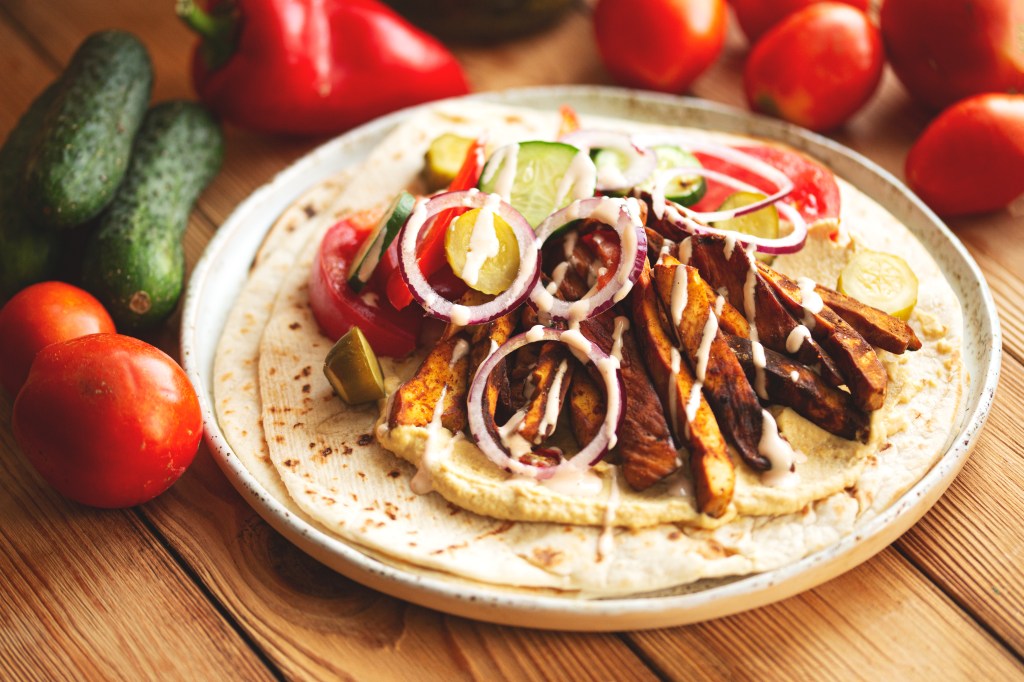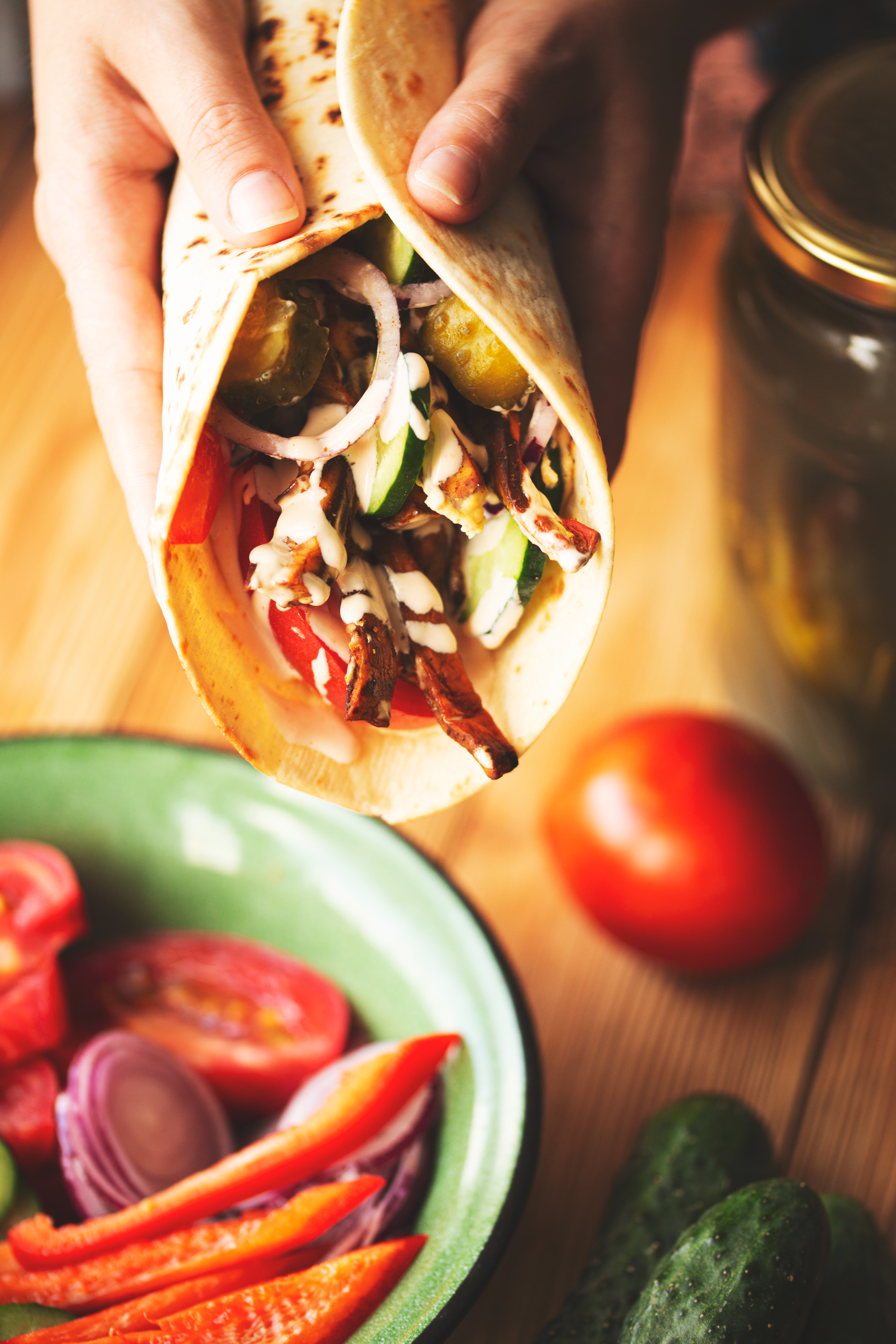 Podać go możemy właściwie na wiele sposobów – tak jak ja z plackiem, hummusem, warzywami i sosem jogurtowym lub z frytkami albo w formie burgera. Opcji jest sporo tak jak z klasyczną shawarmą, donerem czy gyrosem;)