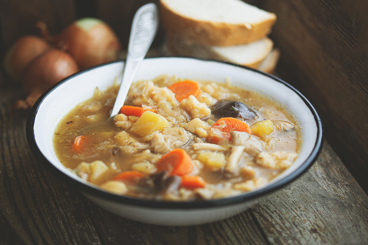 Ostatnio pokazywałem Wam zupę z kiszoną kapustą natomiast ta przyrządzana jest zgoła inaczej – w tej chodzi o smak lekko przyrumienionych warzyw i cebuli oraz o „zarzucenie” jej zasmażką lub mącznymi kluseczkami – stąd jej nazwa. U mnie w domu była wersja z kluseczkami dlatego też taką przygotowałem teraz;)