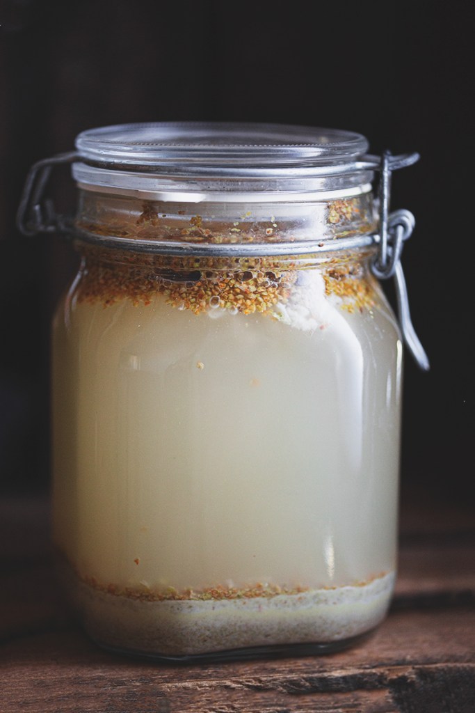 Do wyparzonego słoika wsypałem mąkę i otarte kwiatostany leszczyny, wcisnąłem przez praskę jeden ząbek czosnku.