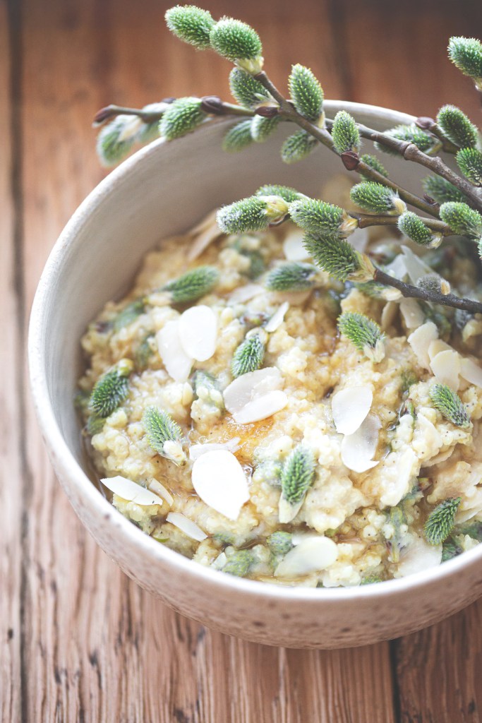 Kiedy kasza jest gotowa odstawiamy ją i dokładamy do niej zimne masło oraz migdały – polewamy wszystko miodem i mieszamy.