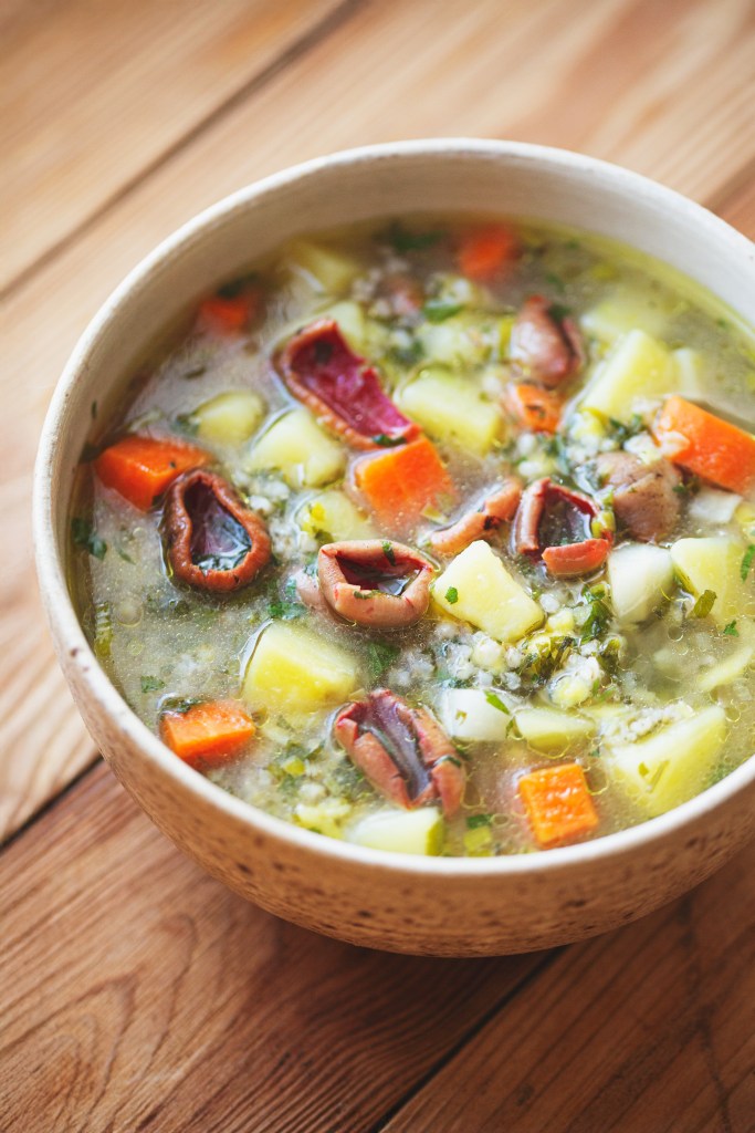 Tą właściwość postanowiłem wykorzystać w mojej wiosennej zupie czyli krupniku, gdyż zarówno smak czarek jak i warzywny smak podagrycznika świetnie pasuję do kaszy.