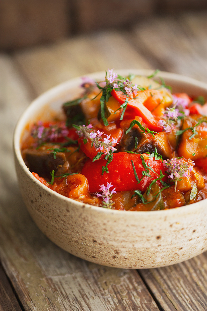 Jest to niezaprzeczalny smak lata – mamy tu wszystkie letnie warzywa. W oryginale w tym daniu znajdują się zioła, które nadają mu aromatu – pietruszka, liść laurowy czy tymianek. Ja w swojej wersji zamieniłem te rośliny na jedno, aromatyczne i pięknie tu pasujące ziele – macierzankę.