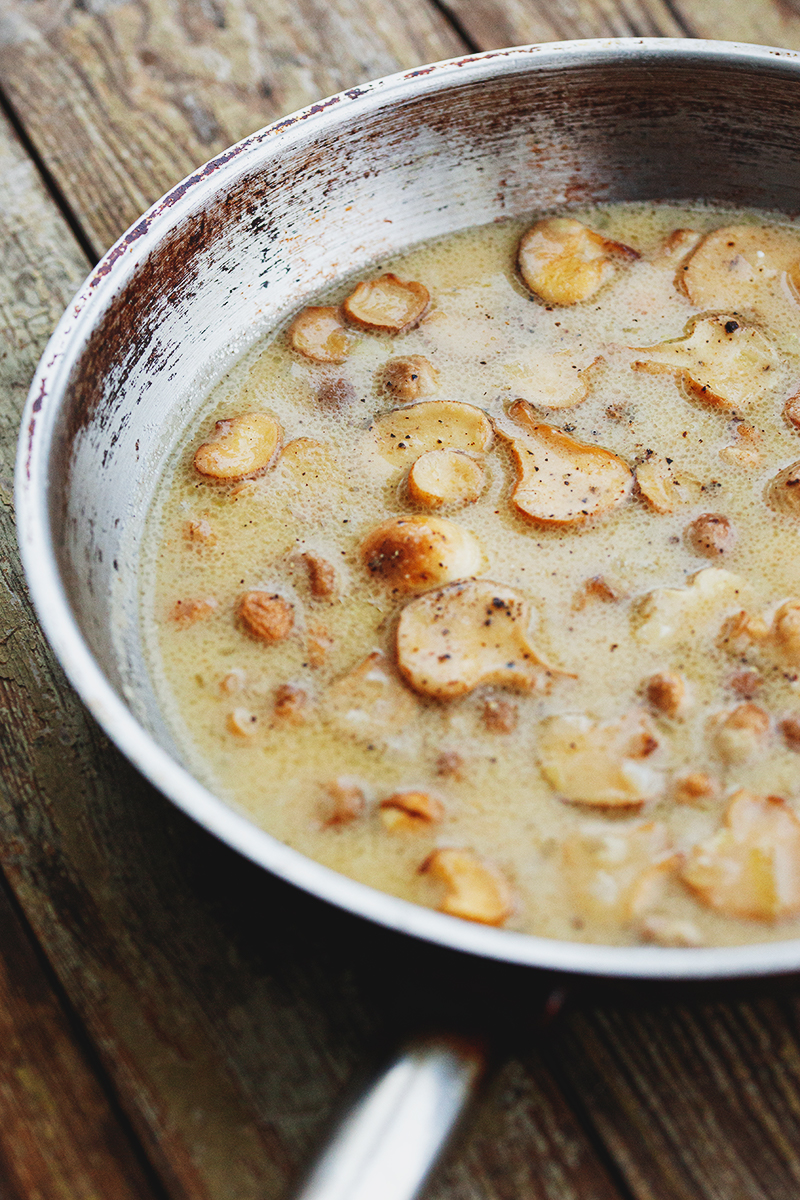 Gotujemy kilka minut na małym ogniu, zaprawiamy na koniec śmietaną i doprawiamy solą, białym pieprzem i gałką (te dwie przyprawy pięknie podkreślają smak purchawek)