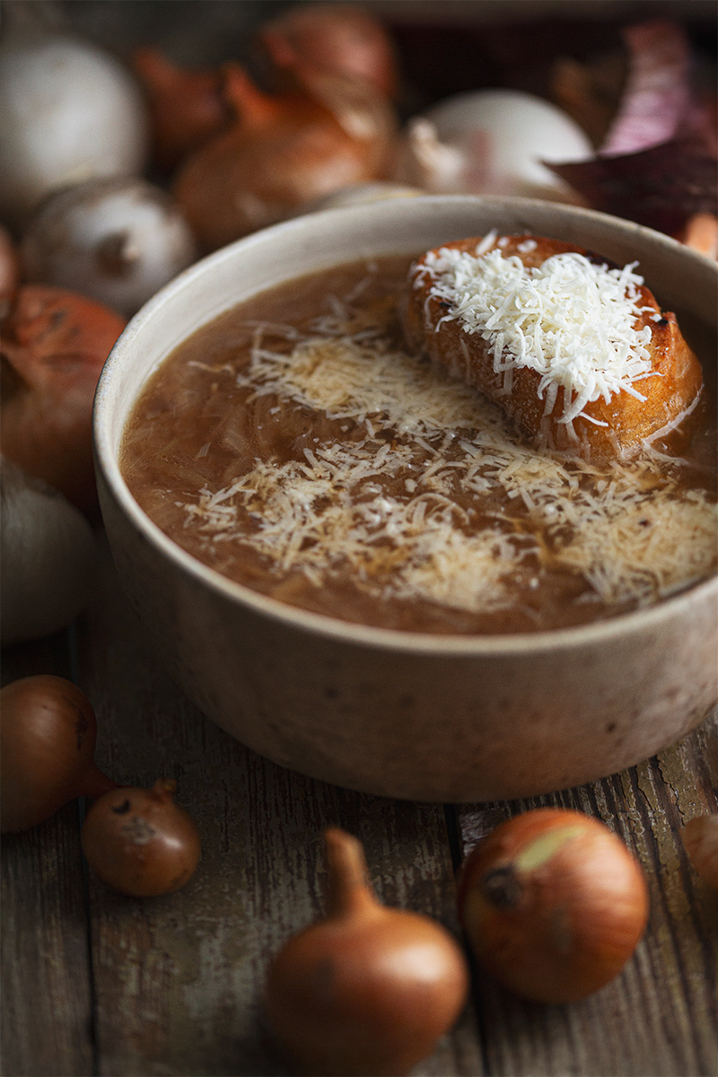 Podstawą sukcesu są tu dwie rzeczy – karmelizacja cebuli oraz bulion. W klasycznym przepisie wykorzystywany jest tymianek, stąd pomysł na zamienienie go na naszą dziką, swojską macierzankę. Zacznijmy więc od bulionu.